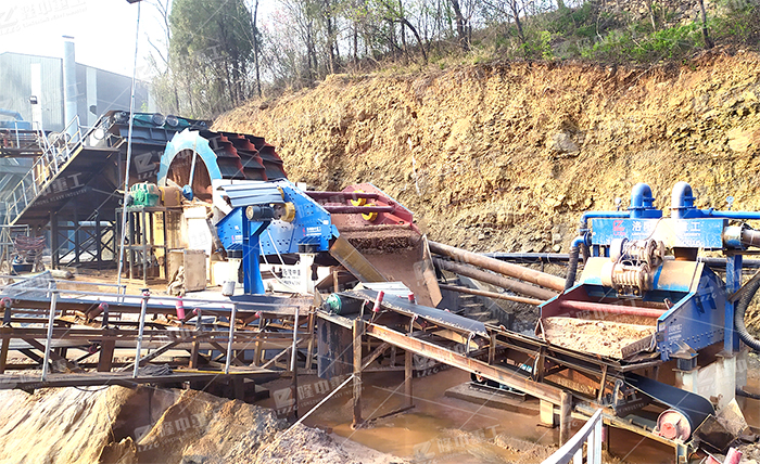 通過輪式洗砂機(jī)與擦洗機(jī)相結(jié)合,洗擦一體使物料與物料充分摩擦去 除表面附著物。混合物料首先進(jìn)入擦洗機(jī)進(jìn)行充分擦洗,達(dá)到泥砂分離效果。